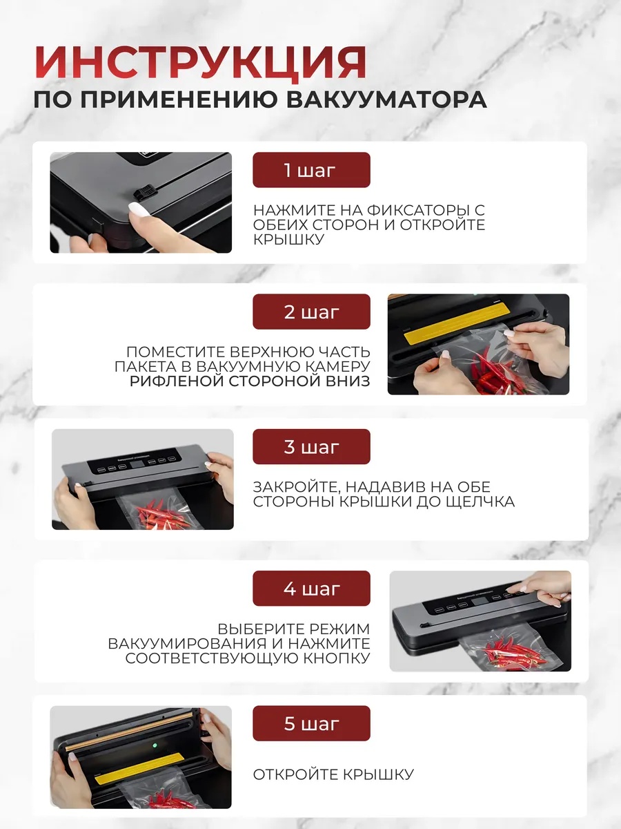С помощью вакууматора вы сможете надолго сохранить свежесть продуктов, предотвратить появление запахов и сэкономить место в холодильнике или морозильной камере. Вы хотите, продлить срок хранения продуктов: мяса, рыбы, овощей, фруктов и сыра до 3–5 раз а так же сохранить вкус, аромат и питательные вещества? Тогда преобретайте универсальный вакууматор и он станет вам прекрасным помощником на кухне.